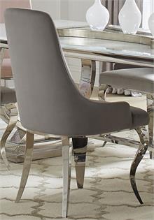 Create an opulent air of sophistication with the elegant Antoine dining collection by Coaster. A long and spacious tabletop seats six guests rather comfortably. Slide up a chair beneath its opaque white tempered glass surface for formal dinners and casual gatherings. Supporting the tabletop is a trestle-inspired stainless steel base with ring-shaped end supports, all of which boast a gleaming chrome finish that reflects the dining room's color palette like a chic mirror. Chairs are crafted from stainless steel, polished to a chrome finish. These gracefully shaped demi arm chairs with cabriole shaped legs offered in grey or blush pink velvets.
