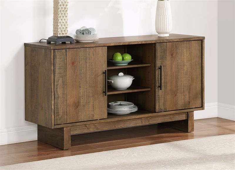 Store all your stuff in the multi-function blended style Server from the Atmore collection by Steve Silver. Elements of industrial and rustic design mix with Mid-Century accents and rustic finish application for a piece of furniture as unique as you are. Sliding front doors allow the configuration of your choice and wire escape backs make this unit great for Entertainment or Dining use. A Dark Driftwood finish and wood score distressing add to the rustic design of this versatile piece.