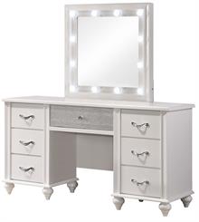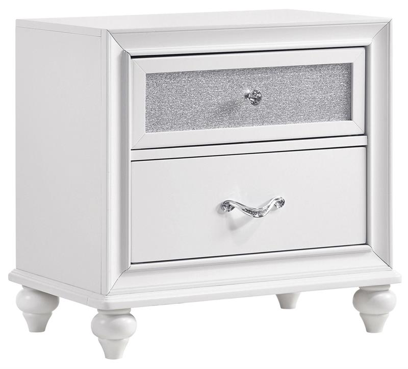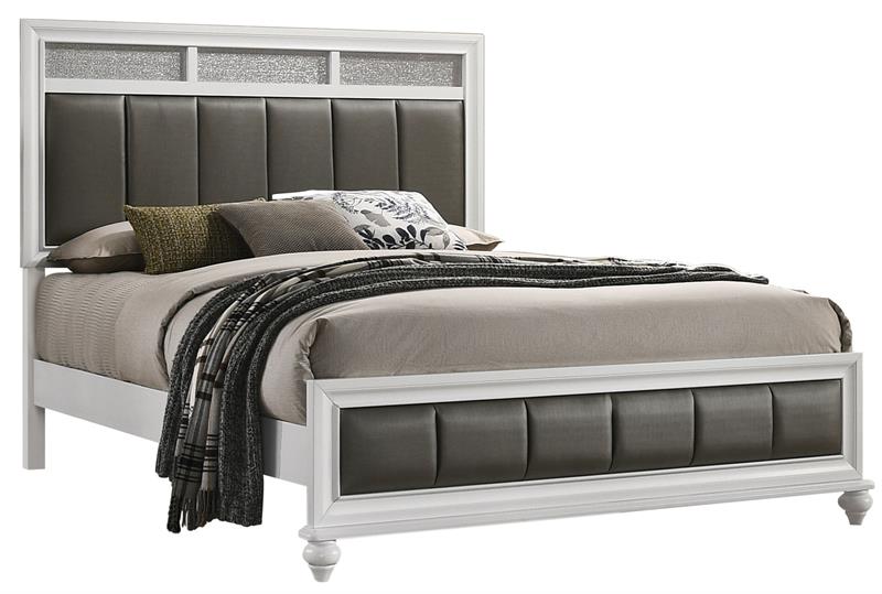 Perfectly suited for more transitional bedrooms, the Barzini four-piece bedroom set includes a panel bed frame, single two-drawer nightstand, and seven-drawer dresser with mirror, all in a crisp white finish with shiny metal hardware with faceted crystal accents. The paneled headboard and footboard offer channel tufted paneling wrapped in a metallic leatherette upholstery. Other extra touches include frame molding, turned feet, and felt lined top drawers. The nightstand offers a convenient power outlet for charging devices before bed. Place this bedroom set in a home to lend a more glamorous vibe.
