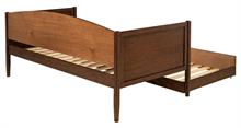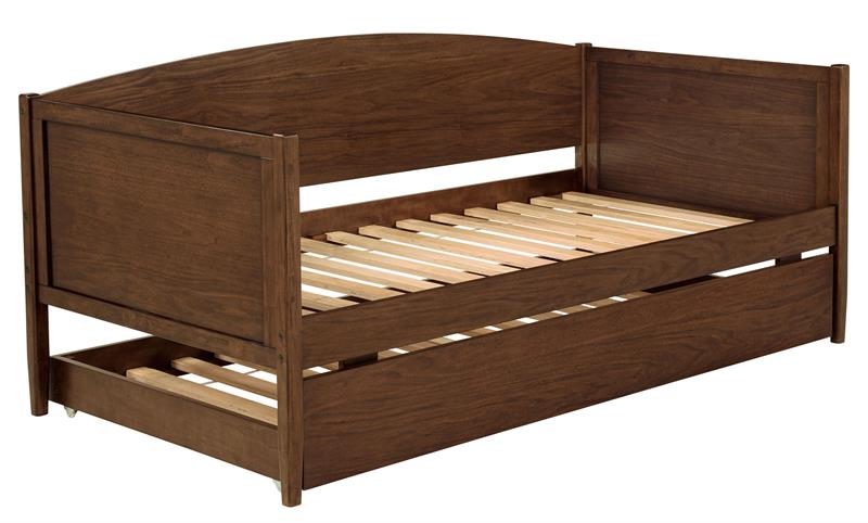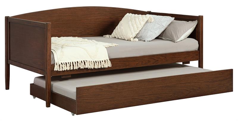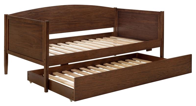 The Bozeman modern classic-style daybed with trundle by Coaster, combines timeless design with practical functionality. The camelback silhouette and square tapered leg posts add elegant touches to its structure. Crafted from Asian hardwood, walnut veneer, MDF, and plywood, it offers durability and style in one package. Finished in a medium walnut tone, the natural wood grains shine through beautifully. The included slats provide sturdy mattress support, while the trundle, fitted with four wheels, glides effortlessly to create additional sleeping space.