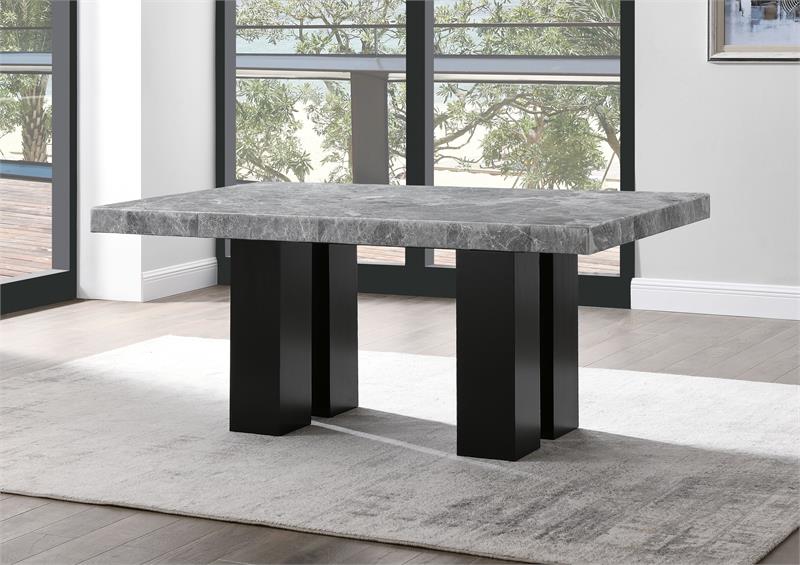 Elegant dining with a modern twist, Camila offers beautiful gray marble with a choice of three chair options – silver or black leatherette or an upscale blue velvet look. All chairs feature nailhead trim to dress up any dining area.