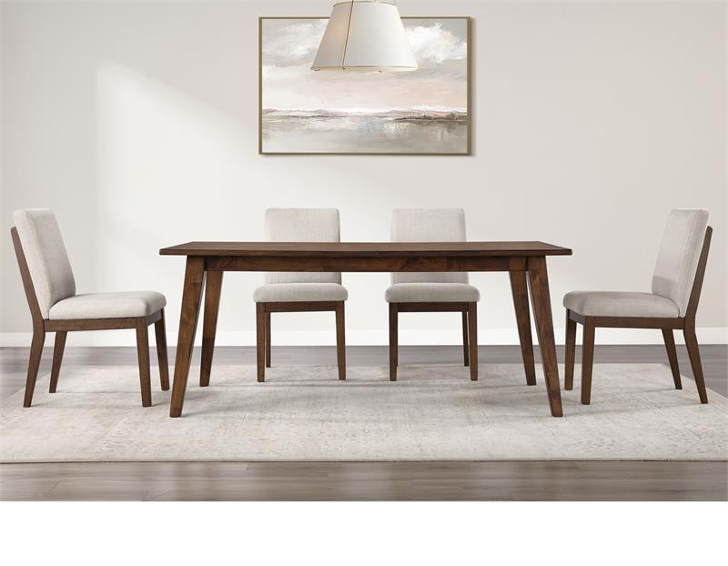 Elegantly casual style arrives in the dining room with the Canton 5-Piece 72″ Upholstered Side Chair Dining Set by Steve Silver. Influenced by mid-century modern design and ready to seat up to six, this set showcases a beautiful butcher block top layup and tapered solid wood legs, exuding both elegance and warmth. Crafted from solid mango and Asian hardwoods, it ensures lasting durability. The hand-stained multi-step brown cherry finish highlights the natural grain, while the oatmeal-colored cushioned chair offers a comfortable, stain-resistant surface. Ideal for intimate gatherings, this versatile set combines timeless aesthetics with exceptional stability, making every meal memorable.