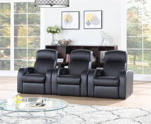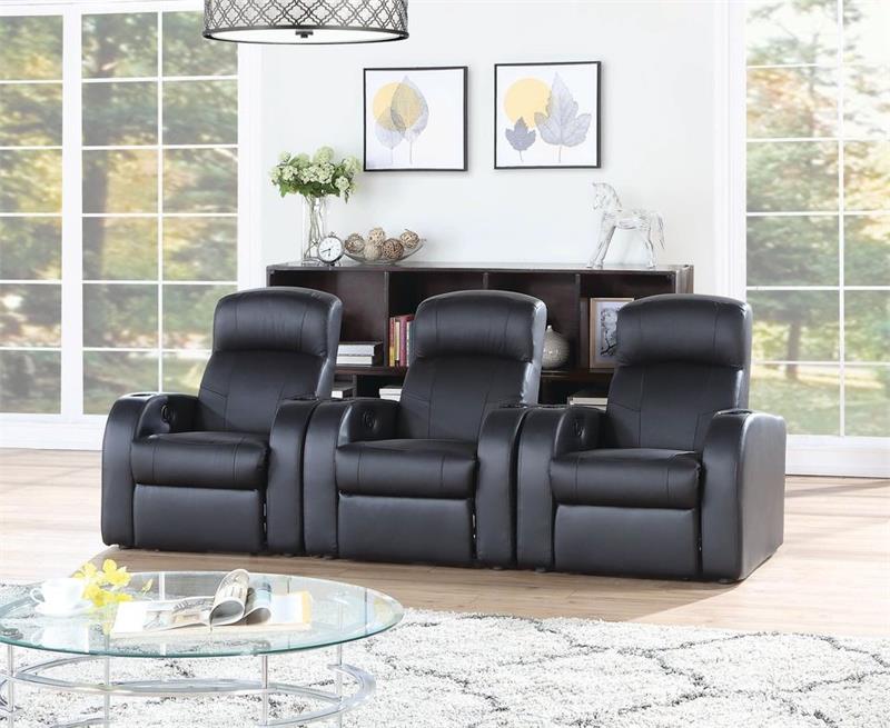 The luxurious Cyrus leather theater seating group by Coaster of America will be a stylish addition to your family room or home theater. High back cushions with padded headrests, and deep pad over chaise reclining seats give the reclining chairs full body support, for the ultimate in relaxation as you watch your favorite movies or television shows. Inside arm recliner release buttons won't compromise the sleek style of this group, in rich black leather match with wide track arms. Wedges between seats offer arm support, with hidden storage for books, magazines, and remotes, and built in cup holders for convenient storage of beverages. Configure the Cyrus theater seating group however you like to fit your room and meet your needs.