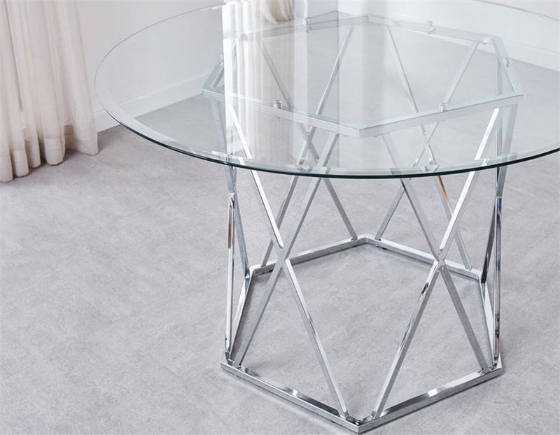 Clean lines and modern styling are the signatures of the new Steve Silver Escondido dining. This mixed media set features a tempered glass top table that showcases a gorgeous hexagonal shaped chrome table base. The Breuer influenced chair features a design that is both modern and classic with a pleated, quilted design that is as comfortable as it is stylish.