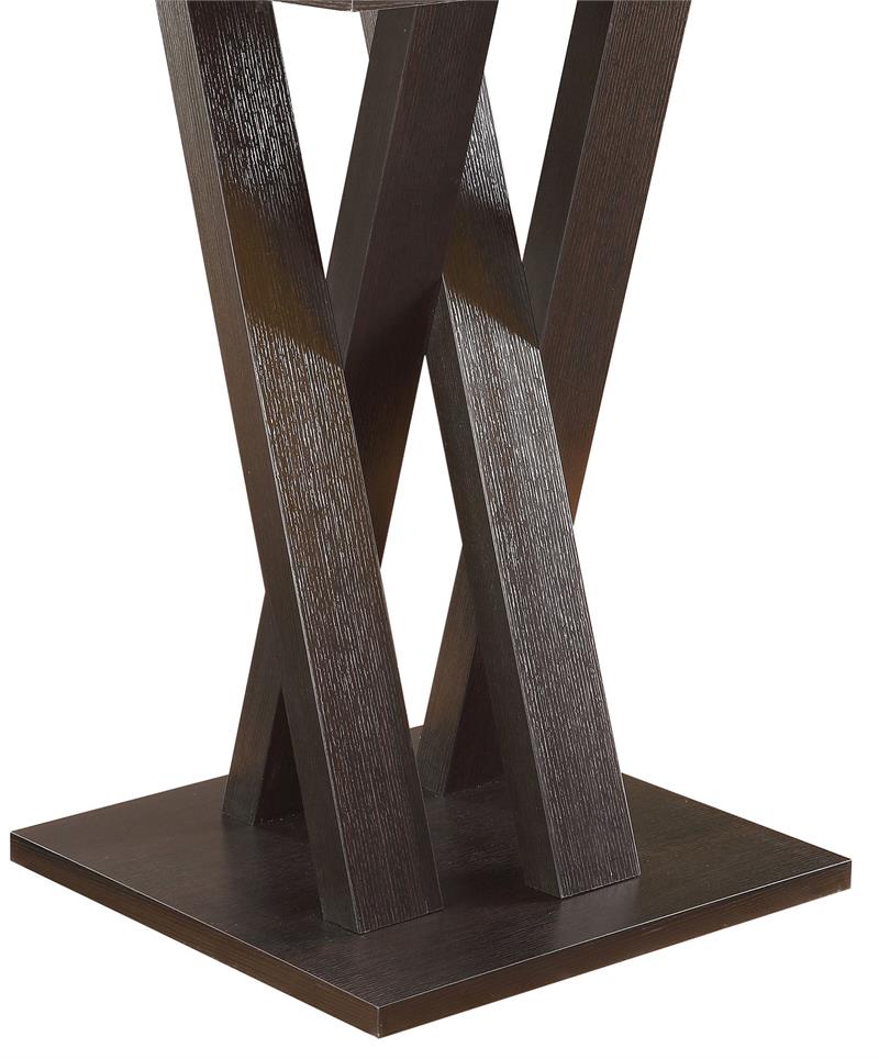 Amplify the style of an eat-in kitchen or dining nook with the gorgeous 3 piece Freda contemporary bar set by Coaster. A bold, crisscross design lends an updated twist to a classic silhouette. Sturdy supports blend appealingly with a handsome, 36'' square wooden top. A lovely, cappuccino-colored finish rounds out its charming appeal. With its strong, stately appearance, the bar stool is a handsome addition to a kitchen or recreation room. A wide seat back and convenient foot rest provide luxurious comfort and relaxation. The sumptuous texture of black leatherette lends exquisite softness and appeal, while its curved back legs add an unexpected touch of sophistication. With a 29-inch height, this lovely stool is an ideal seating option for a kitchen counter or wet bar. Classically designed, it's an excellent match for a variety of decor styles.
