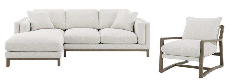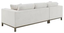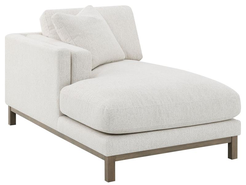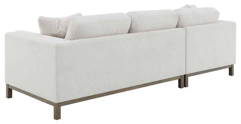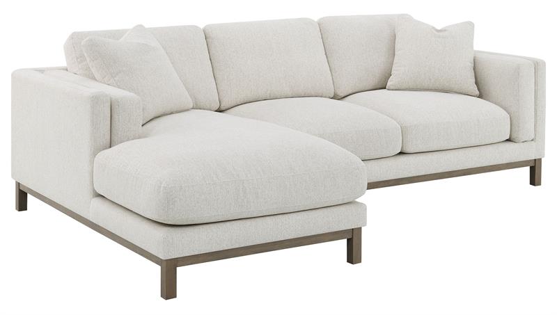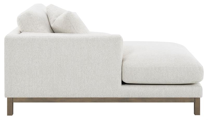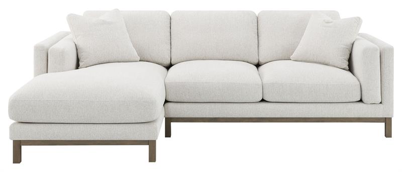 Indulge in the inviting comfort of the Geneva modern sectional sofa by Coaster, thoughtfully designed with a left side chaise to accommodate your personal lounging preferences. Upholstered in a soft, textured bouclé fabric, complemented with a solid wood pedestal base in ash brown, creating the perfect stylish seating foundation. Fulling encased engineered wood frame, sinuous spring seating and foam combined with premium blend fill create a plush, resilient feel. Complete with reversible back cushions, reversible single cushions, removable chaise cushion and coordinating accent pillows, this sectional becomes the stylish focal point of a welcoming, contemporary living room.