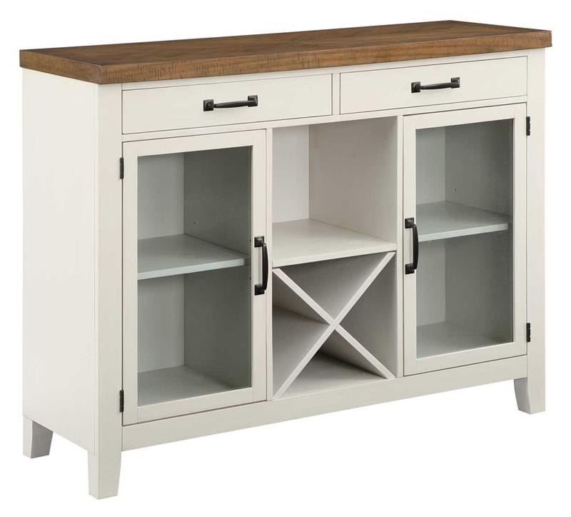 Relaxed, transitional styling in a neutral two-tone milk and honey finish are the hallmarks of the comfortable Hyland counter dining set by Steve Slver. A storage counter table anchors any dining area ably with a 20-inch insertable leaf to expand to 80-inches for seating of up to eight. The milk and honey finish marries up with the oil-rubbed nickel hardware and vegan rawhide upholstered chair to create a fresh yet approachable dining set you will treasure for years.