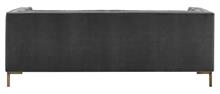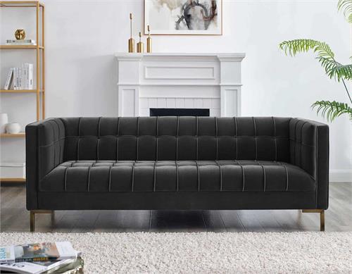 Designed for luxe living, the Isaac gray velvet sofa by Steve Silver, combines sleek lines and sumptuous finishes to create the ultimate opulent effect. This alluring sofa follows a classic mid century modern design but updates the style with features such as brass, angular legs and rich velvet fabric. The channel stitching in a vertical and horizontal pattern is an elegant design detail that is sure to draw the eye and attention of onlookers. As engaging as the style itself is, Isaac is also built for everyday family life. The fabric is treated to to help guard against sticky fingers and muddy paws.