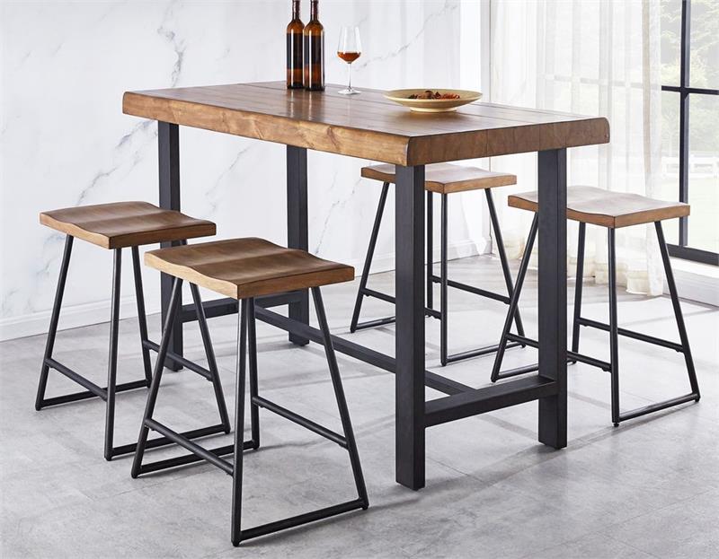 You'll love to come to dinner with this counter height set from Landon, by the Steve Silver Company. This transitionally styled mixed media set presents a substantial look in a medium sized dining package. The beefy table top features birch veneers in a natural honey finish and is paired with a weighty iron base. The wooden seated stool has a rustic appearance while sporting a s shaped seat for added comfort.