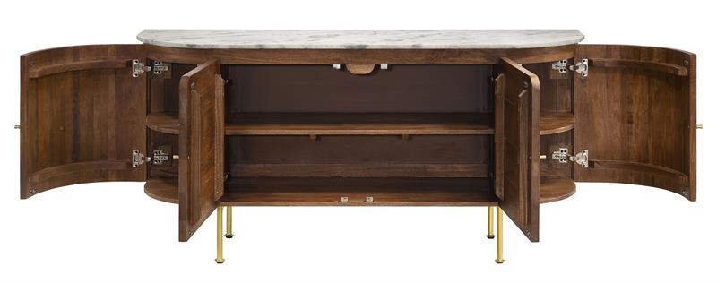 Exuding stylish personality, the Ortega contemporary server by Coaster, is a chic blend of mid-century and more updated design ideals. Ample interior storage is showcased behind four doors that create an oval silhouette, offering dimension and visual interest to a kitchen or dining room. The top of the server is beautiful, natural white marble that lends luxurious elegance to any setting. The case boasts beautiful mango woods construction in a warm, natural finish that lends earthy sophistication, complemented with brass inlay details for metallic shine. Vertical fluting decorates two side doors on the server, offering a perfect complement to the Ortega collection dining table.