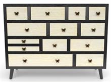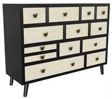 Papillon adds a little whimsy and a lot of function to any room with this 13-Drawer Accent Sideboard. Antiqued brass butterfly pendants serve as the hardware on this artisan-crafted ebony and washed ivory finished cabinet that will bring a welcome design accent to any room. The asymmetrical drawer design lends visual interest to the piece while offering a generous storage platform for different sized items. Dimensions: 46 x 16 x 35.5