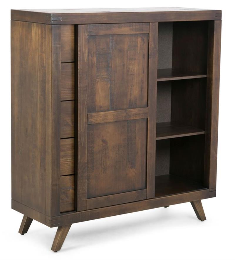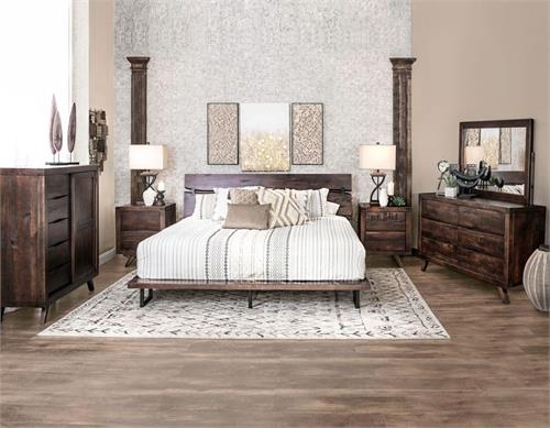 Features: •Solid pine with black metal accents •Rustic live edge treatment. •Mid-century modern styling. •Mission bow tie accents •Distressed finish adds to primitive style of the bedroom •Platform bed has metal supports legs and multi-slat base. •Bachelors Chest features drawers and shelves behind doors. •Dresser has six drawers for generous storage space •Cocoa finish •Steve Silver Pasco Includes - queen bed, dresser, mirror and 1 nightstand.