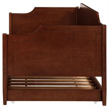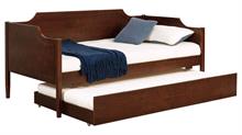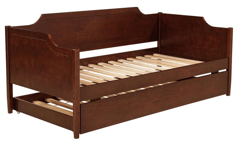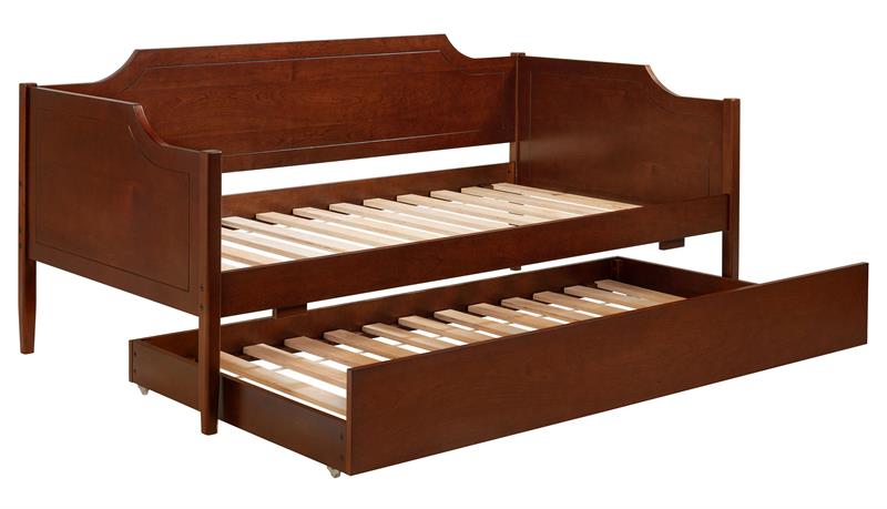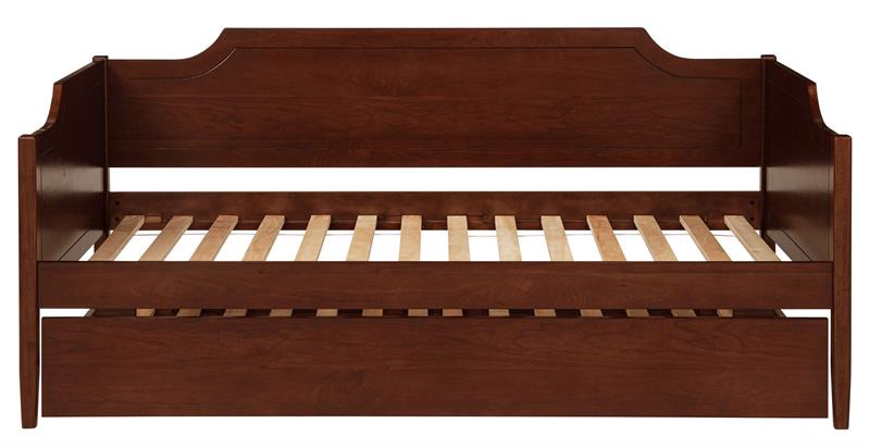 The Redding modern classic-style daybed with trundle by Coaster, merges timeless elegance with practical design. The camelback silhouette and refined panel detailing add sophistication, while its construction from Asian hardwood, plywood, MDF, and cherry veneer ensures durability. The rich cherry finish highlights the natural wood grain, enhancing its classic appeal. Included slats provide reliable mattress support, and the smooth-gliding trundle with four wheels offers convenient additional sleeping space.