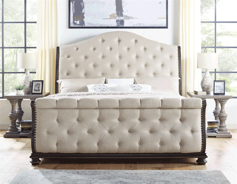 Details abound in this Sleigh Bedroom collection from Rhapsody. Intricate scrollwork and flowing romantic lines are finished in a lustrous, multi-step molasses stain with edge rubthrough that replicates the look of a cherished time-worn antique. The scrolled button-tufted bed adds to the nostalgia with a look as comfortable today as it was at the turn-of-the-century.