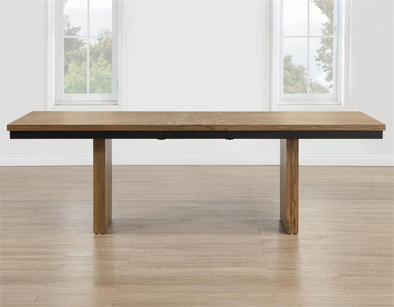 The first thing you notice with the Roatan 7-piece 80-96 inch Dining Set by Steve Silver, is the top, featuring a reverse-matched diamond veneer inlay. The beauty of the limba wood creates a stunning palette for table settings, making it the centerpiece of your dining room. At 80 inches, the table effortlessly expands to 96 inches on a smooth ball-bearing glide, comfortably seating up to ten. The leaf conveniently stores within the table mechanism, saving valuable storage space.