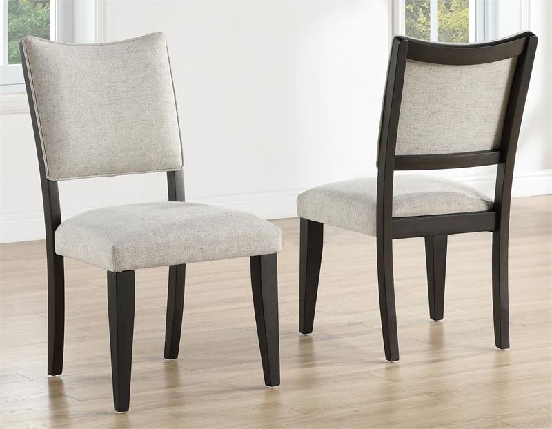 The cushioned 5-inch seats are both elegant and comfortable, upholstered in a light grey oatmeal fabric with a subtle herringbone pattern that adds a touch of sophistication without overpowering your décor. The modern black and toffee finish highlights the natural beauty of the limba wood, ensuring you’ll love this set for years to come.