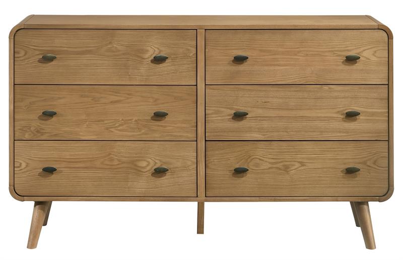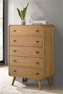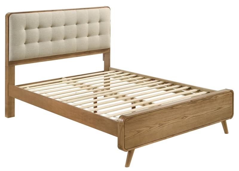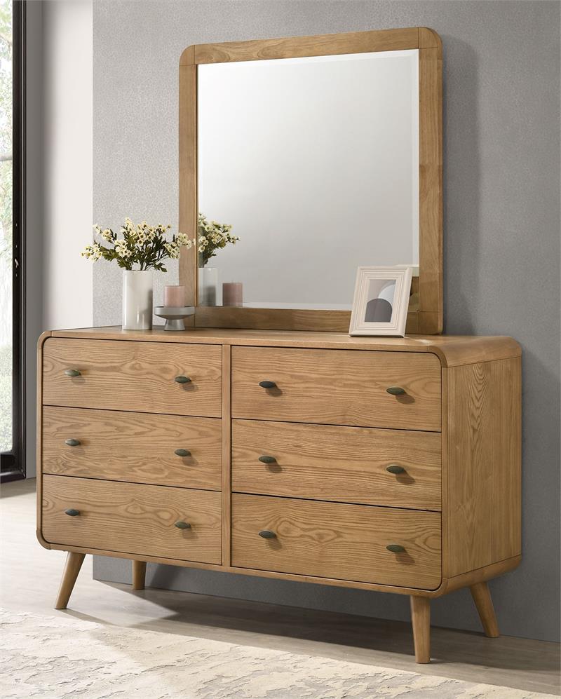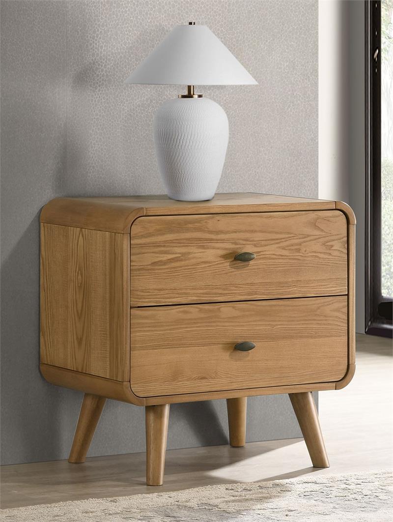 Transform your bedroom into the ultimate retreat with the Robyn mid-century modern bedroom set by Coaster. Expertly crafted from pine, engineered wood, and walnut veneer, the set includes a bed, nightstand, dresser, mirror, and optional chest for a cohesive look. Rounded edges, tapered legs, and square tufting lend a retro-inspired flair, while felt-lined top drawers in case pieces and dual USB ports in nightstand add practical convenience. This collection combines style and functionality for a truly luxurious bedroom experience.