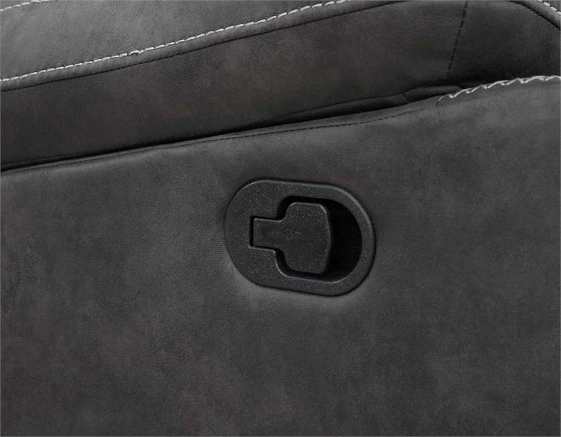 Introducing the dark gray Rudger manual reclining sofa by Steve Silver – the ultimate in comfort and style. Its bomber jacket-like microsuede cover with contrasting baseball stitch and clean lines exude a rugged yet refined charm. The deeply padded seats and bustle backs, with fiber-wrapped foam and pocket coil construction, offer extra padding where you need it.