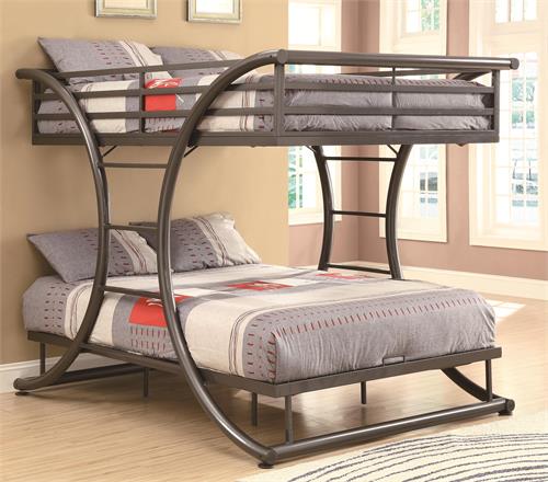 This fun and stylish Stephan full-over-full size bunk bed comes in a sleek gunmetal finish for a piece that will fit in easily with any style of decor. The metal curve design softens the modern feel and sturdily supports the bunks. Whether you are seeking space saving features or simply a fun and attractive piece, the Stephan bunk bed design will give your child's bedroom or guest room an updated look you won't easily tire of. Attached ladders and top-bunk guards rails provide additional safety features.