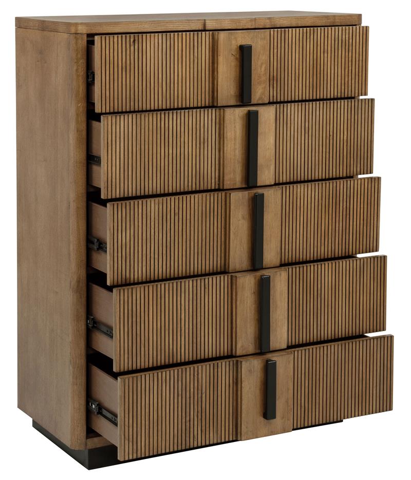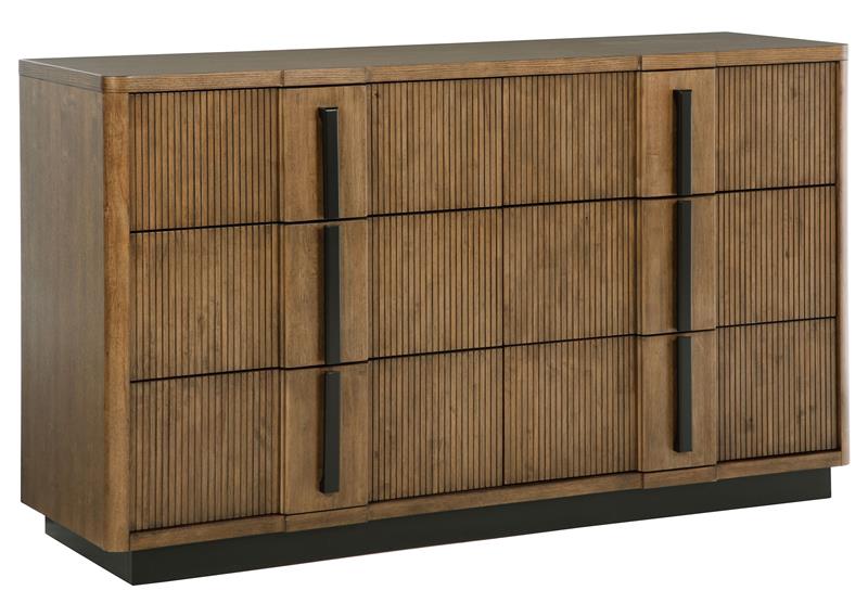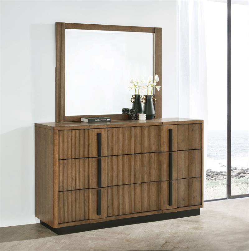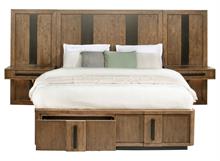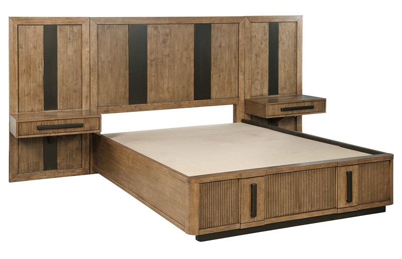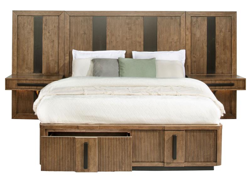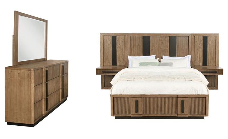Includes: queen storage bed, 2 wall panel nightstands, dresser and mirror.