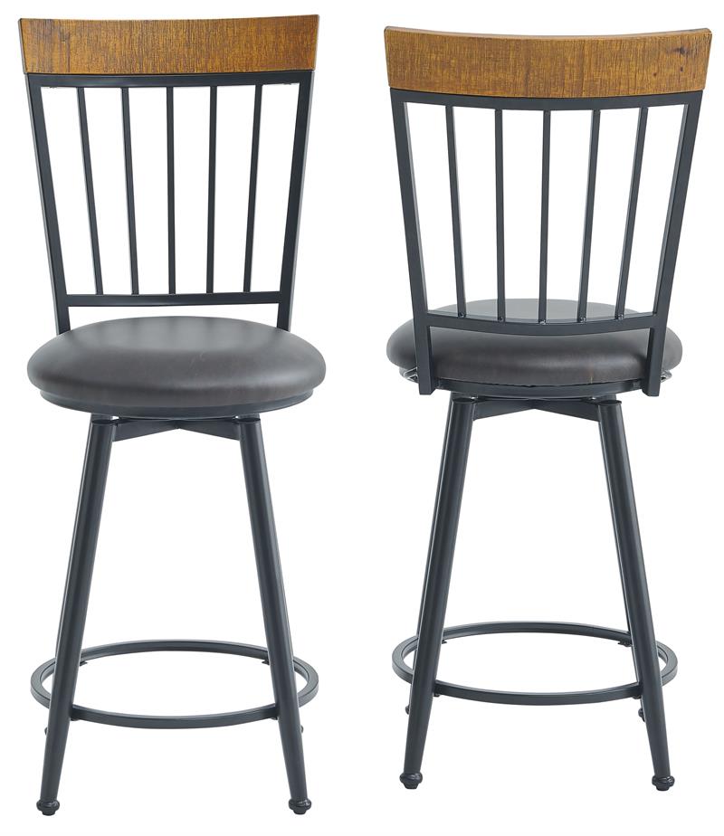 Sturdy and rustic, the Tyler 38-inch Bar Set delivers a slice of nostalgia mixed with a casual and relaxed design.A glowing rustic Chestnut finish highlights the grain and character of the birch veneers in a distressed application that beautifully accents the powder-coated ebony metal. Storage abounds in the back of the bar for all your serving needs including a hanging stemware rack. The Tyler Counter Stool offers 360 degree swivel with a padded, easy-care black leatherette seat that cleans with the wipe of a damp cloth. Comfort, style and organization…all delivered with the Tyler Counter Bar Set.