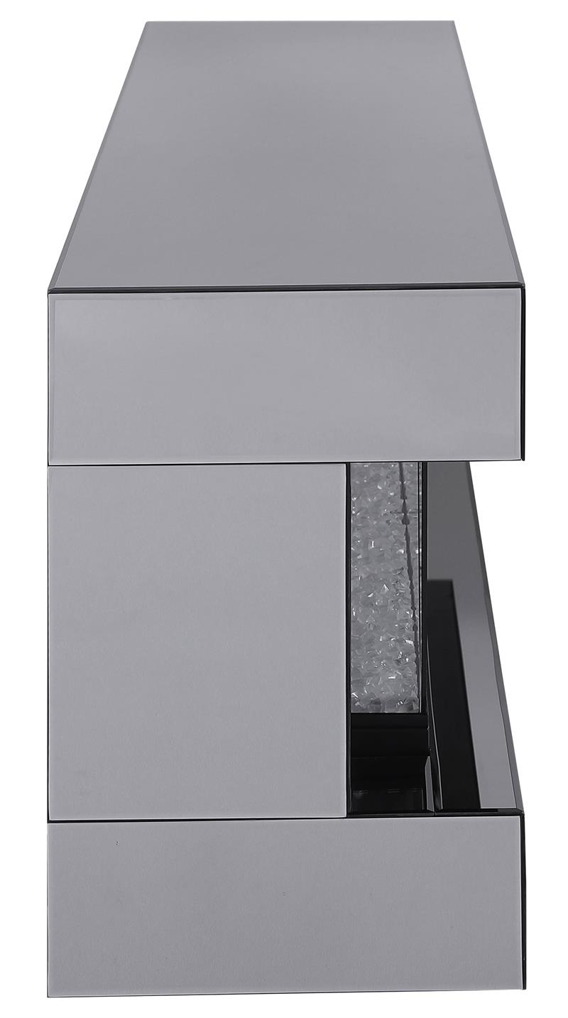 Create incredible ambiance in your living room with the modern Vallerie TV stand by Coaster, that includes a visual flame box. It delivers realistic three-dimensional flames that offer 13 color options and adjustable brightness to create the perfect mood. The case features clean, straight lines that complement in a modern or minimalist living space. It accommodates a television up to 72 inches, and is a perfect choice under a wall-mounted television, creating a place for peripherals and decor that bring personality. A grey mirrored finish lends chic flair, sure to complement your contemporary decor.
