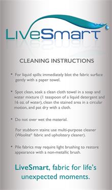 •Chair is covered in LiveSmart fabric that combines a performance fabric with a performance finish to give fabrics inherent durability and longevity. Spills bead up, sitting on top of the fabric until they are gently blotted for cleanup and is moisture repellent, stain-resistant, designed for heavy-duty wear with barrier protection to keep your fabric clean.