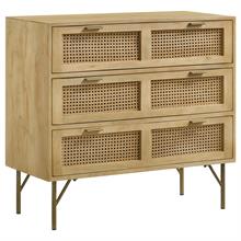 Designed from mango wood, the Zamora three-drawer accent cabinet by Coaster, offers up an eco-friendly furniture piece for sustainable homes. Each of the three drawers is adorned with a sleek pulls in an antique brass finish for a polished flair. Lending a vintage-inspired touch are also front panels designed with a natural woven cane for extra texture. This wonderful accent cabinet also rests on bracket style metal legs in the same antique brass finish as the drawer hardware, tying it all together. With plenty of storage, keep this accent cabinet in a space for linens, throws or whatever you need to keep tidy.